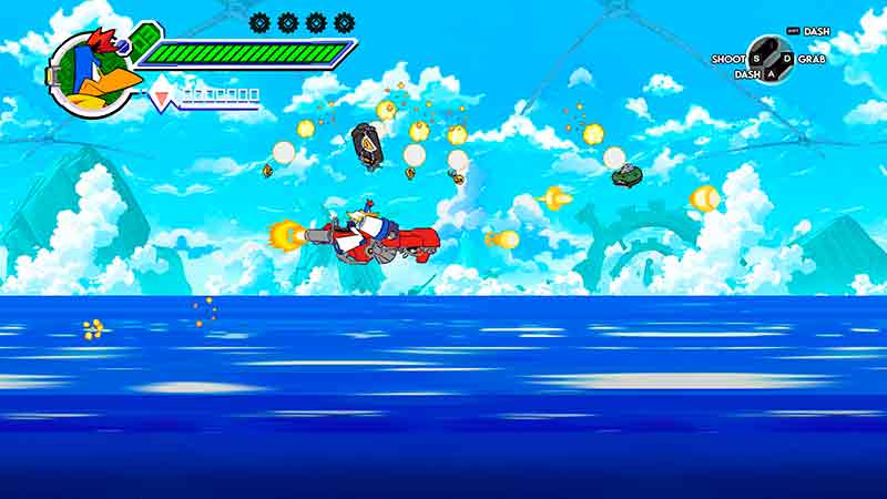 E por falar em inimigos, eles são bem fofos e carismáticos, lembrando bastante os robozinhos de Sonic e Mega Man. Inclusive, é possível usar sua mão/gancho para puxar um personagem que tem um corpo de mola e montar nele, atravessando assim partes perigosas como espinhos, por exemplo.