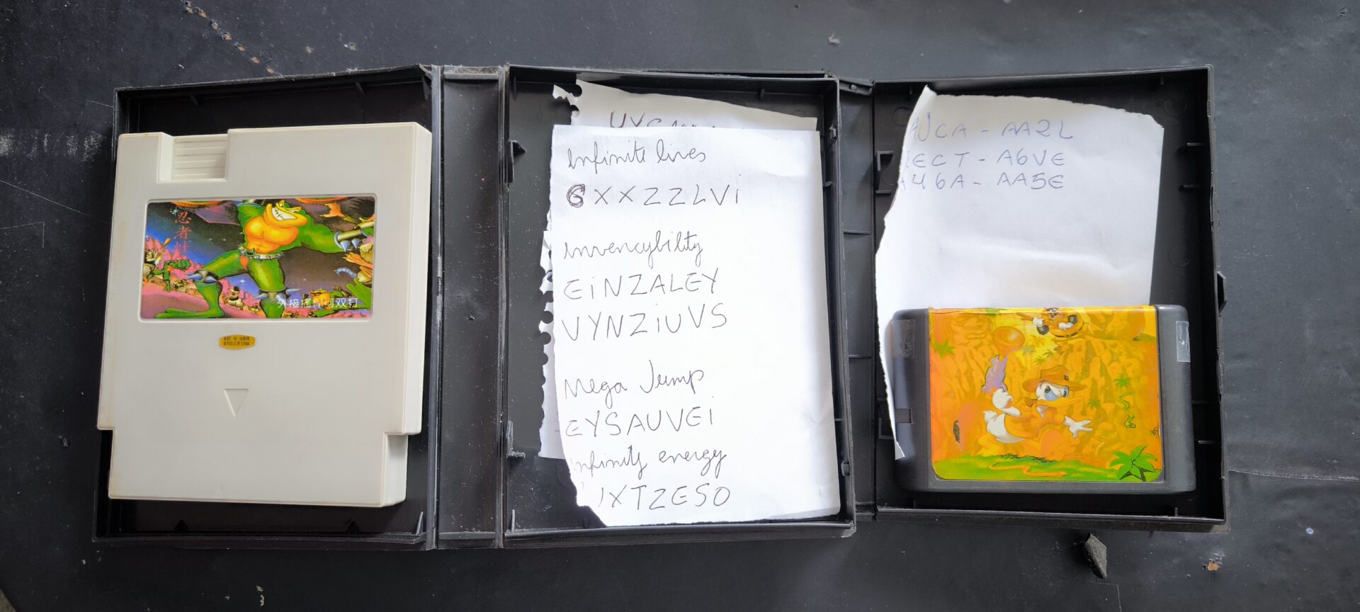 Códigos do ”’Game Genie” anotados à mão para usar nos consoles reais e aproveitar ao máximo a experiência de jogar do inicio ao fim sem perder vidas.