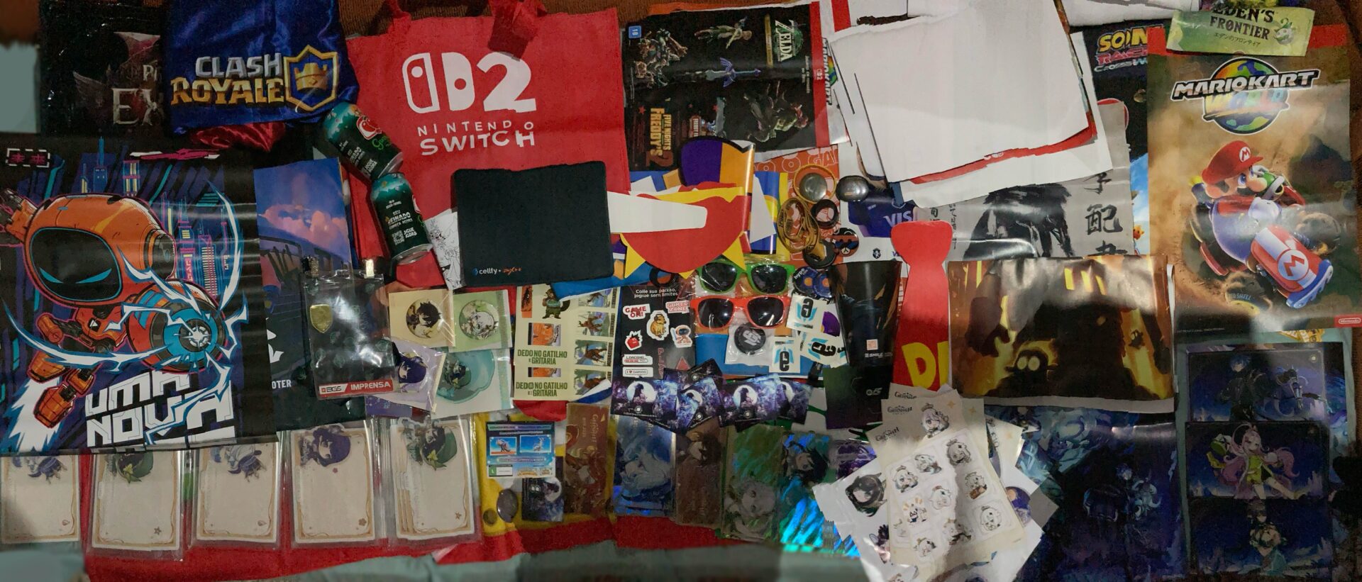 Mas não posso esquecer de falar dos brindes da BGS, nesse 4 dias de evento consegui 130-150 brindes do evento… foram bastantes brindes, a maioria também eram de Grandes Estandes, e entre outros… mas esse ano tivemos ótimos brindes para falar, e até os alimentos que foram distribuídos como brinde também conseguiram matar minha fome durante o evento, e vale mencionar que consegui esses brindes nas últimas horas do evento quando estava acabando.