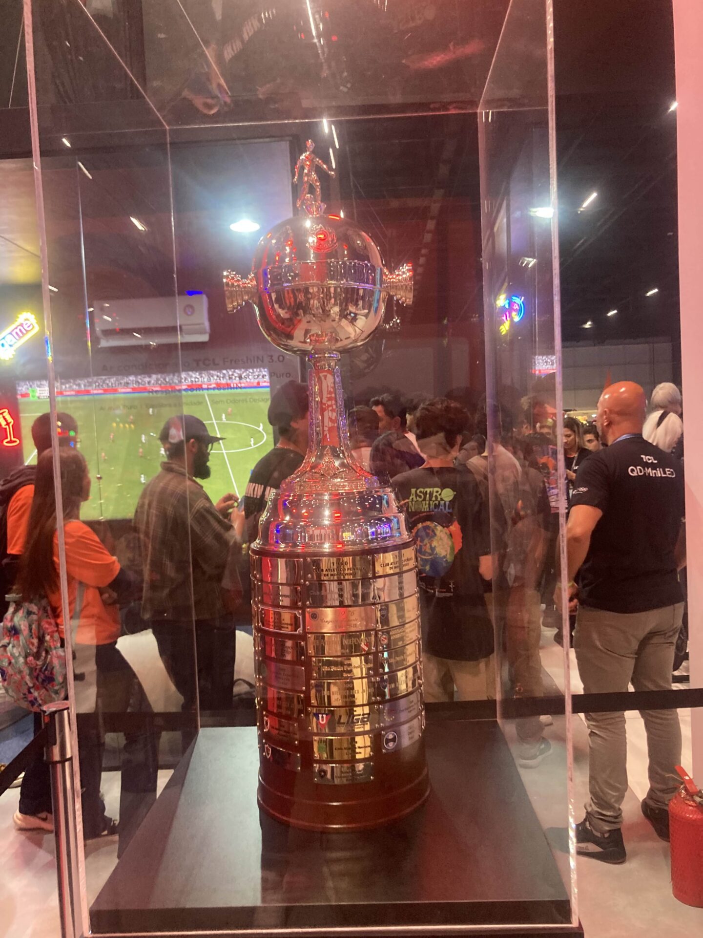 A taça Libertadores também marcou a cena no estande da TCL. Radiante, convidava o público a registrar o momento e a palpitar sobre o próximo campeão do campeonato. Aproveitei para fotografar ao lado da taça e ganhei um adesivo estiloso da taça que coloquei no meu crachá.
