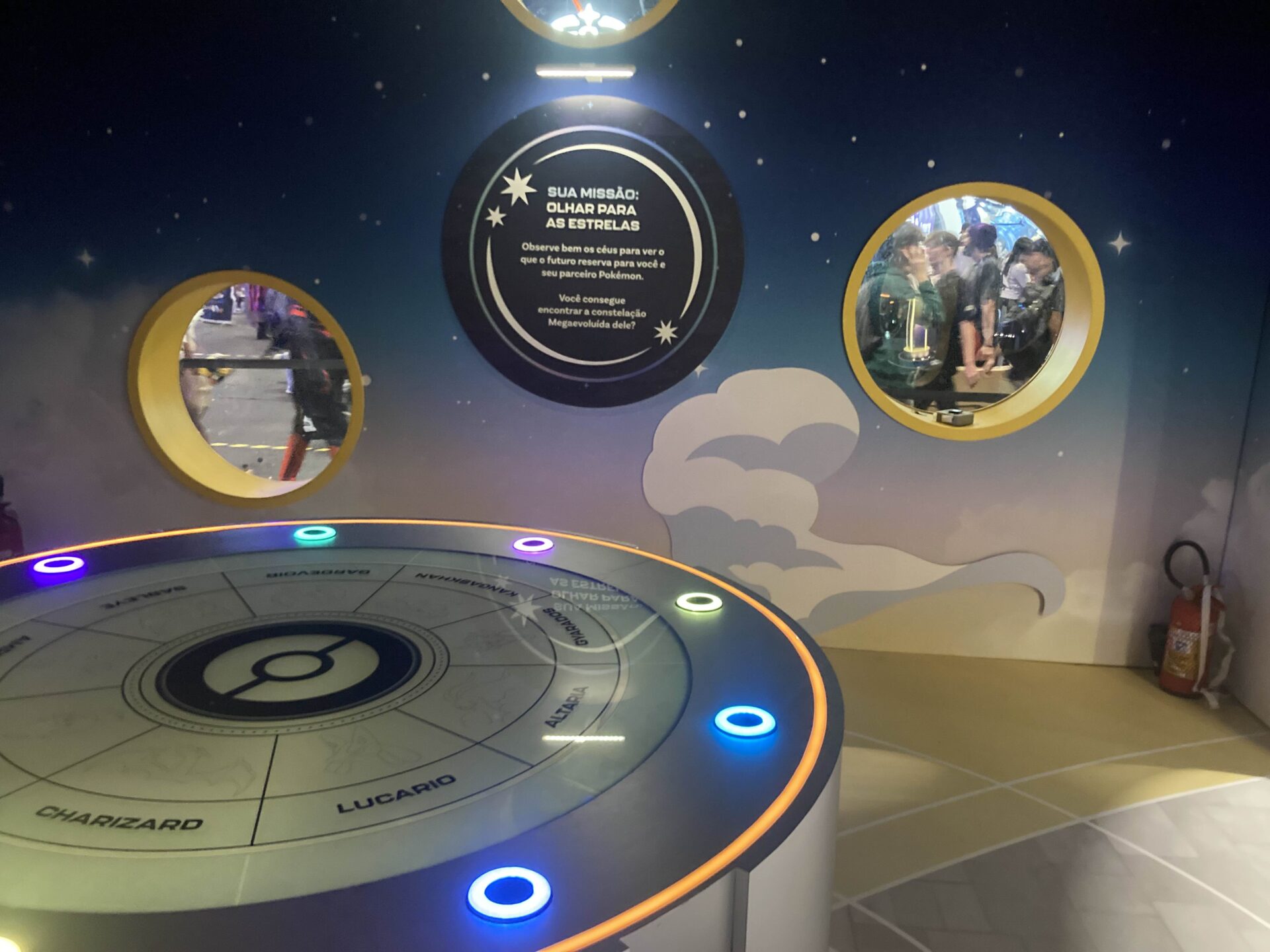 Com o cartão em mãos, segui para outra área do estande, onde pude observar as constelações e localizar meu Pokémon. Foi incrivelmente fácil encontrar o Lucario ao pressionar um botão, o que iluminou sua imagem. Depois, colaram um adesivo do cartão do Pokémon. Em seguida, dirigi-me a uma área onde peguei um pequeno adesivo do meu Pokémon e o fixei no cartão. Depois, fui para a área em que passei o cartão e coloquei minha mão para escanear e confirmar que eu era o dono do Pokémon, e funcionou! Por fim, gravei um vídeo na última área, que pude acessar posteriormente por meio de um código QR e que experiência maravilhosa que resumi por aqui.