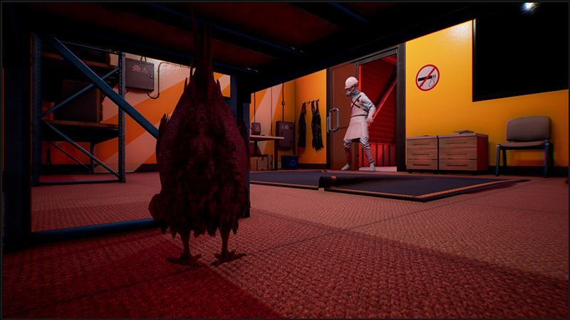 Desde o primeiro minuto, o jogo deixa claro seu impacto. Você controla uma galinha prestes a ser abatida pela rede fictícia Saborus. No instante final, ela escapa do gancho da linha de produção e cai no chão imundo do matadouro — e é ali, entre máquinas ensanguentadas e ruídos metálicos, que a fuga começa. A abertura cria um contraste marcante: primeiro um vídeo institucional colorido e amigável da marca, exaltando qualidade e bem-estar animal; logo depois, uma imersão brutal na realidade suja e violenta das instalações. É um choque proposital, e o jogo não tem medo de mostrar sangue, crueldade e carcaças de animais dilacerados.