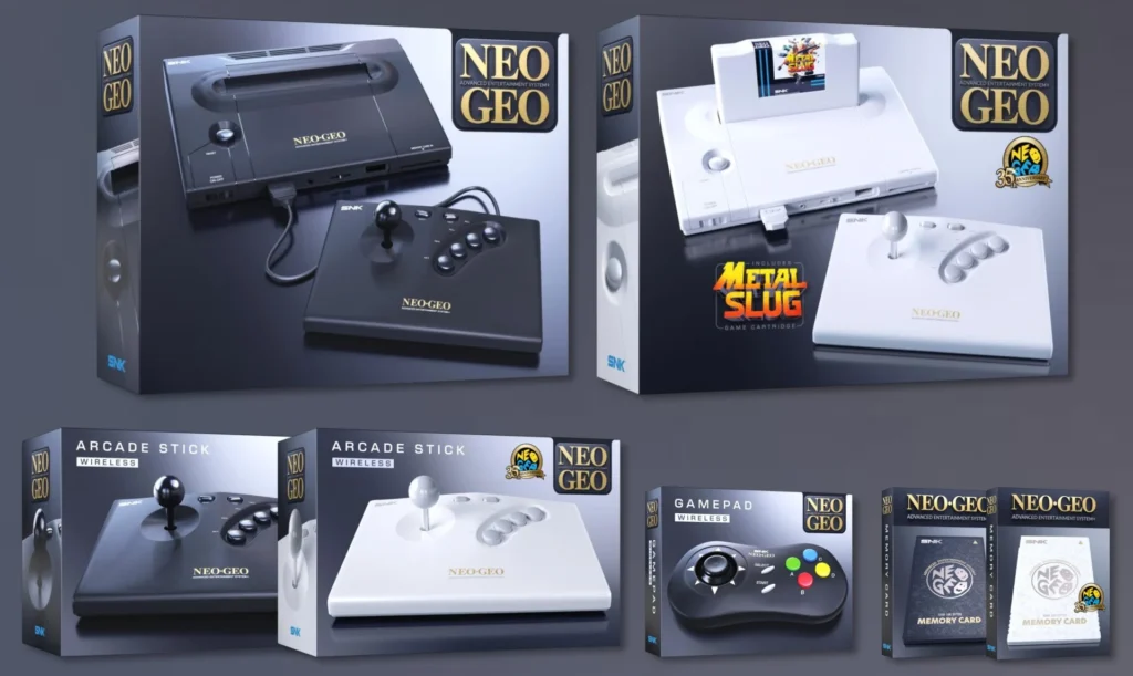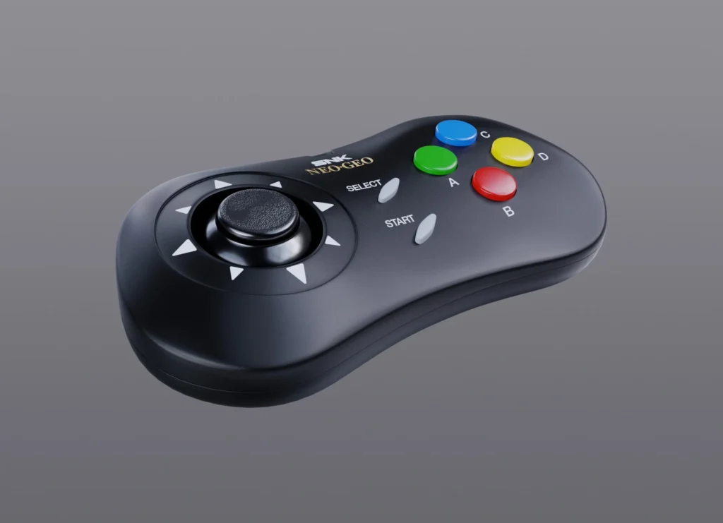O Arcade Stick replica o layout dos gabinetes MVS da SNK em escala 1:1, com opção com fio ou sem fio. O Gamepad também é réplica fiel do original, com aquele thumbstick micro-switched característico e o layout de quatro botões que a galera conhece de cor. E o Memory Card, já citado, compatível com o console antigo.